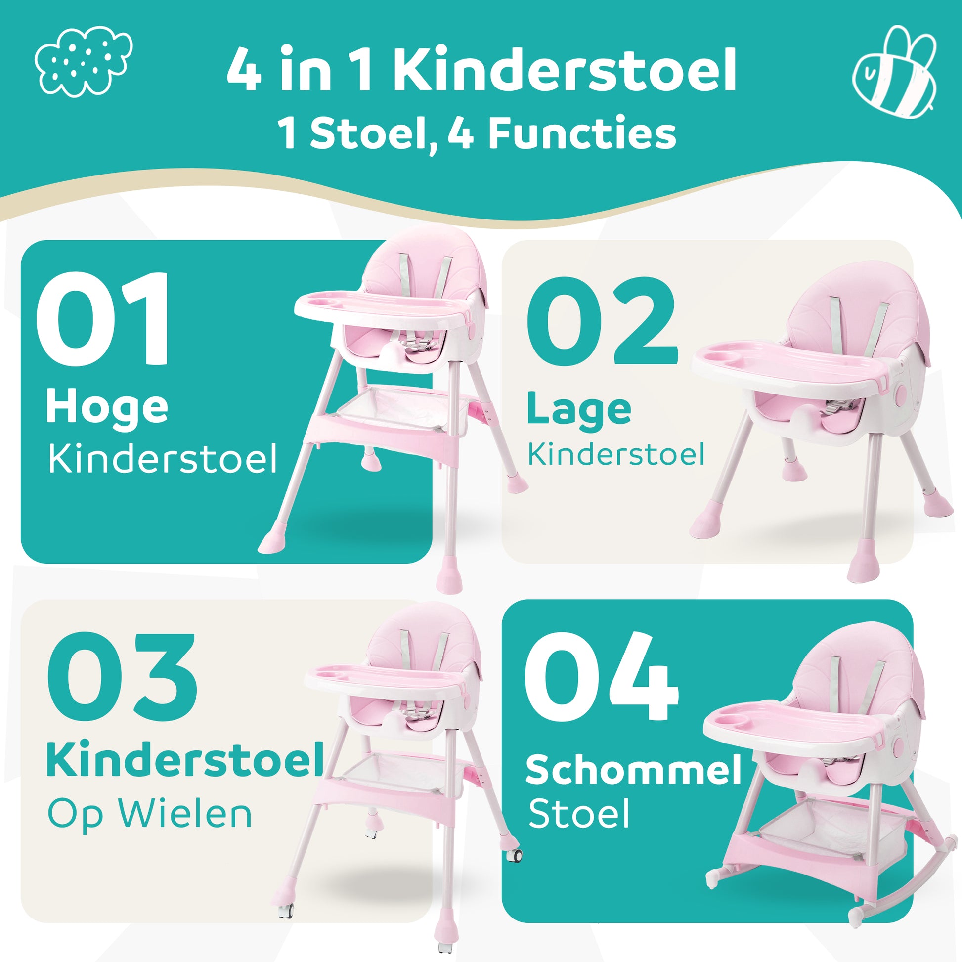 - Functies: 4-in-1 (schommelstoel, hoge.lage eetstoel, speelplek)