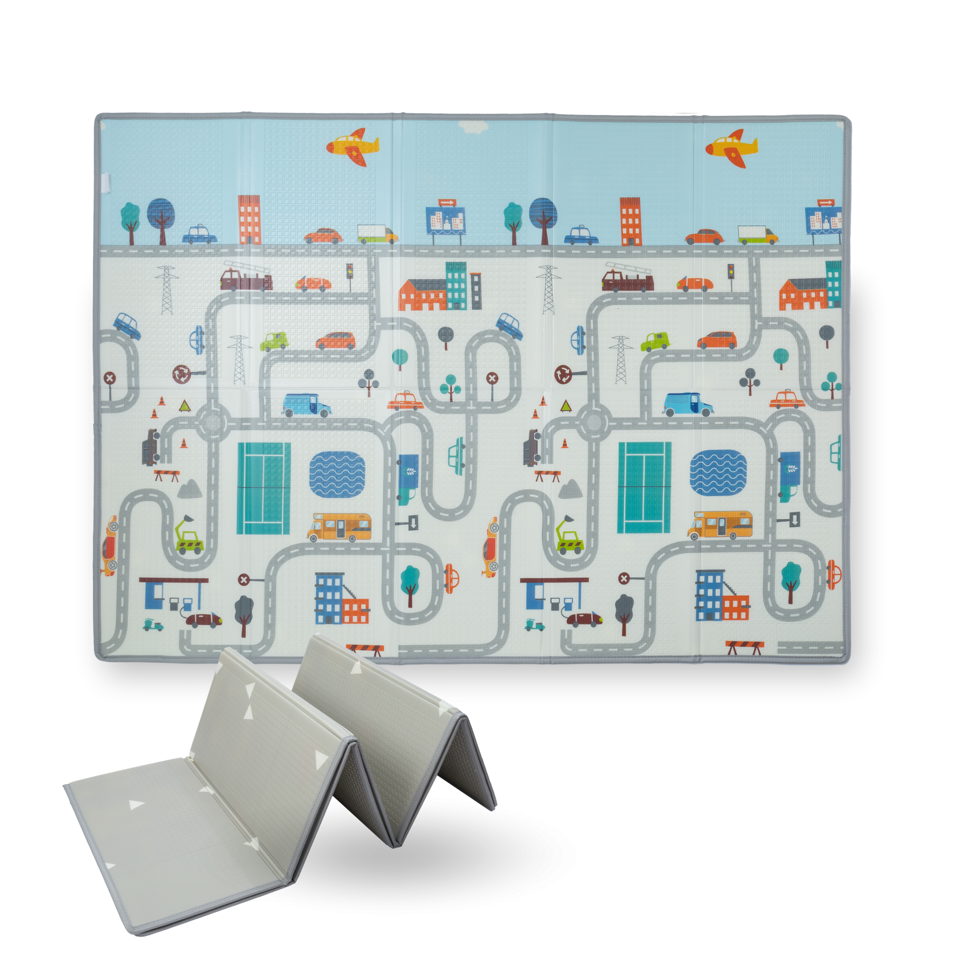 Dubbelzijdig design – Eén zijde met een speels ontwerp van auto’s, vliegtuigen en wegen om met speelgoed overheen te rijden, en een neutrale zijde die in ieder interieur past.